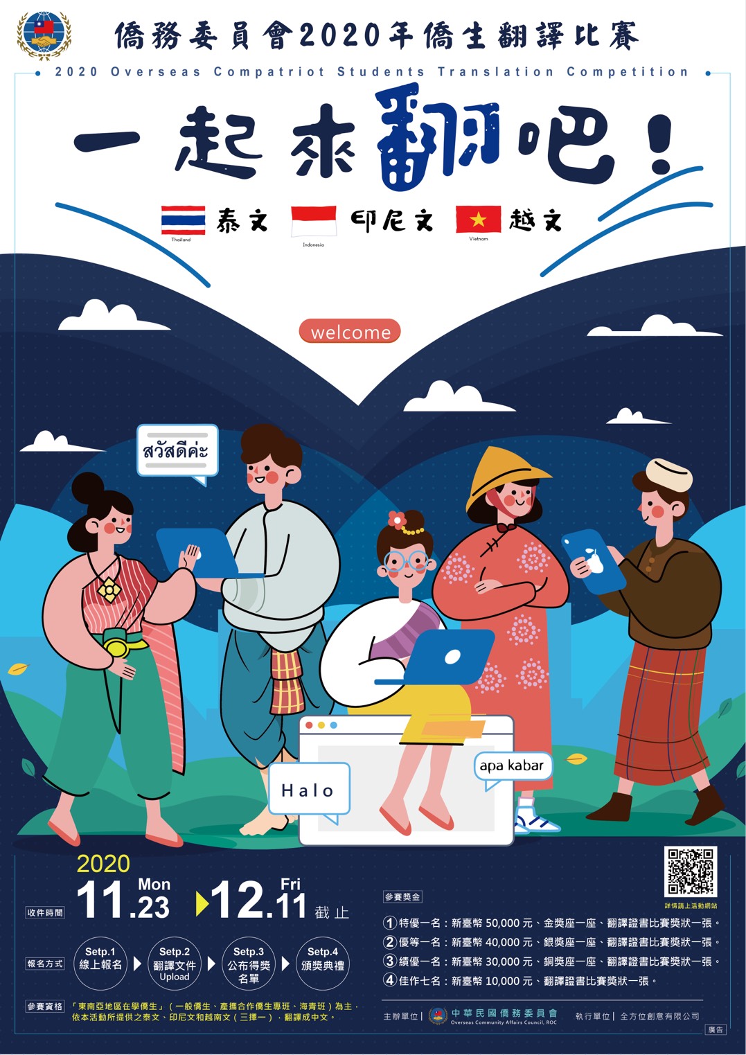 為鼓勵全球各地優秀赴臺求學之華僑子弟,並將其培育成為海外臺商企業及當地產業所需之技術人才,僑務委員會特地辦理「2020年僑生翻譯比賽」。 相關活的訊息摘錄如下: