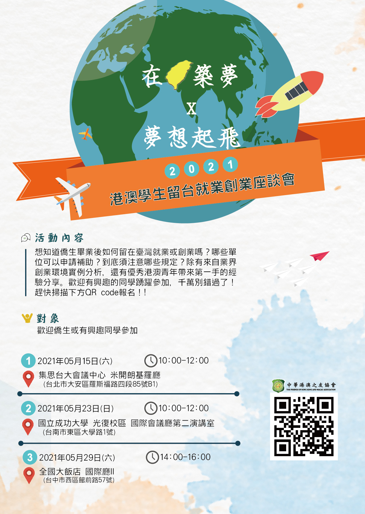 想知道僑生畢業後如何留在臺灣就業或創業嗎?哪些單位可以申請補助?到底須注意哪些規定?除有來自業界創業環境實例分析,還有優秀港澳青年帶來第一手的經驗分享。歡迎有興趣的同學踴躍參加,千萬別錯過了!趕快點選下方報名連結報名!!