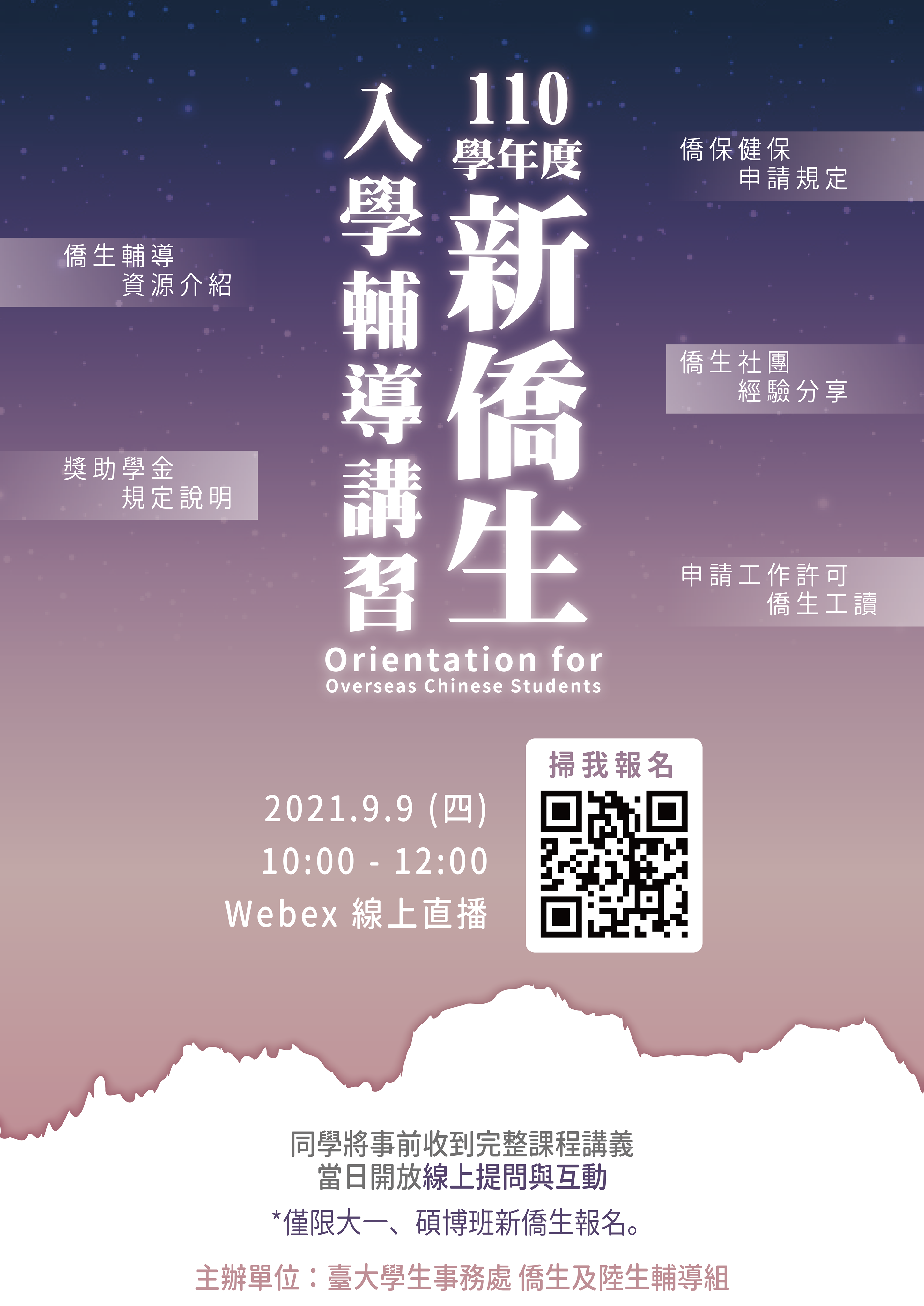 本組將於2021年9月9日辦理「110學年度新僑生入學輔導講習」(線上課程)