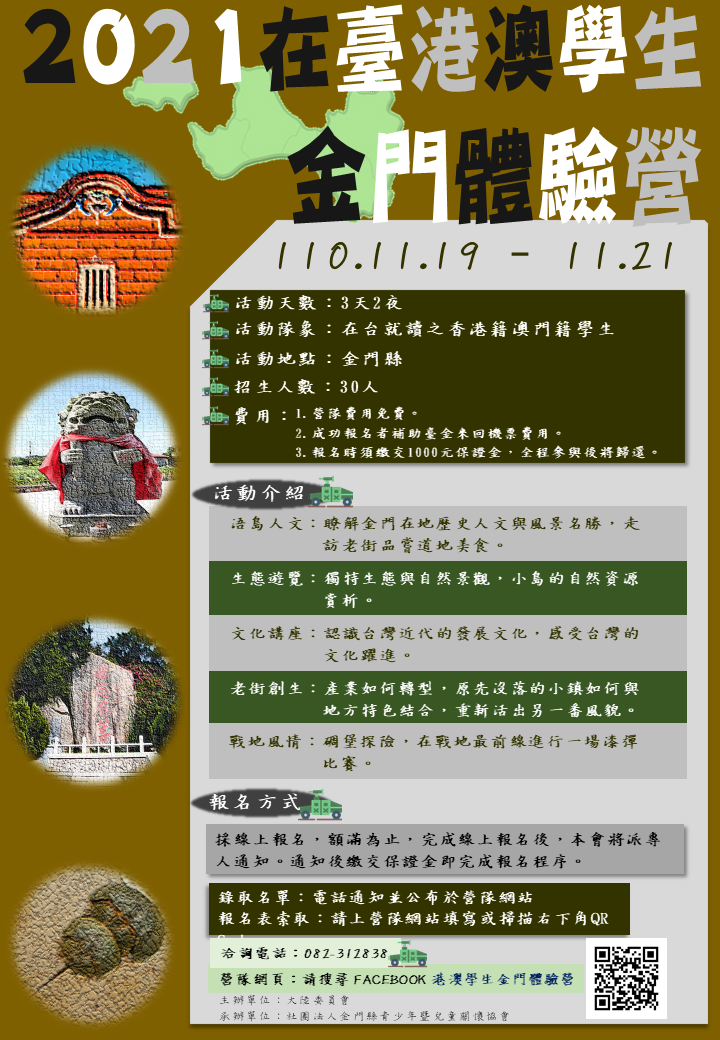 陸委會將於110年11月19日至21日辦理【在臺港澳學生金門體驗營】活動,帶領港澳學生體驗金門文化、感受離島特殊的歷史風情。