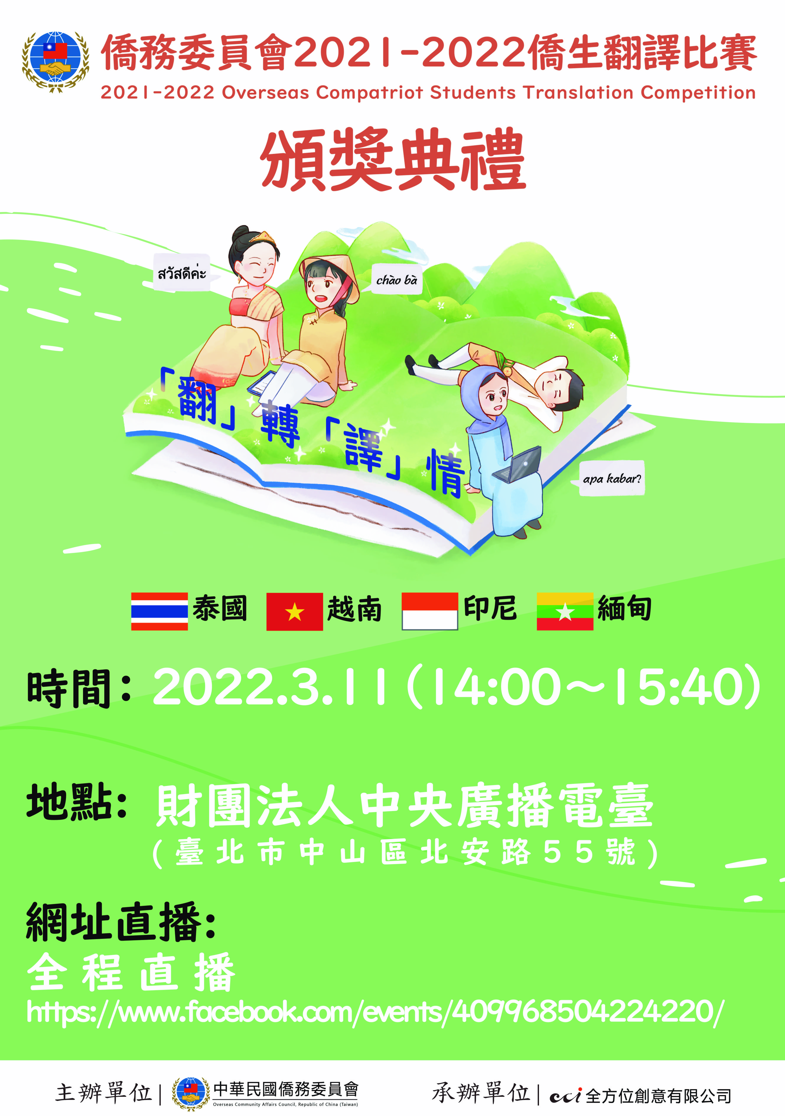 「2021-2022年僑生翻譯比賽」頒獎典禮訂於3月11日(星期五)14:00-15:40於財團法人中央廣播電臺舉行,當天FB全程直播,請鼓勵學生在不影響課程或實習之餘,踴躍觀看線上直播。