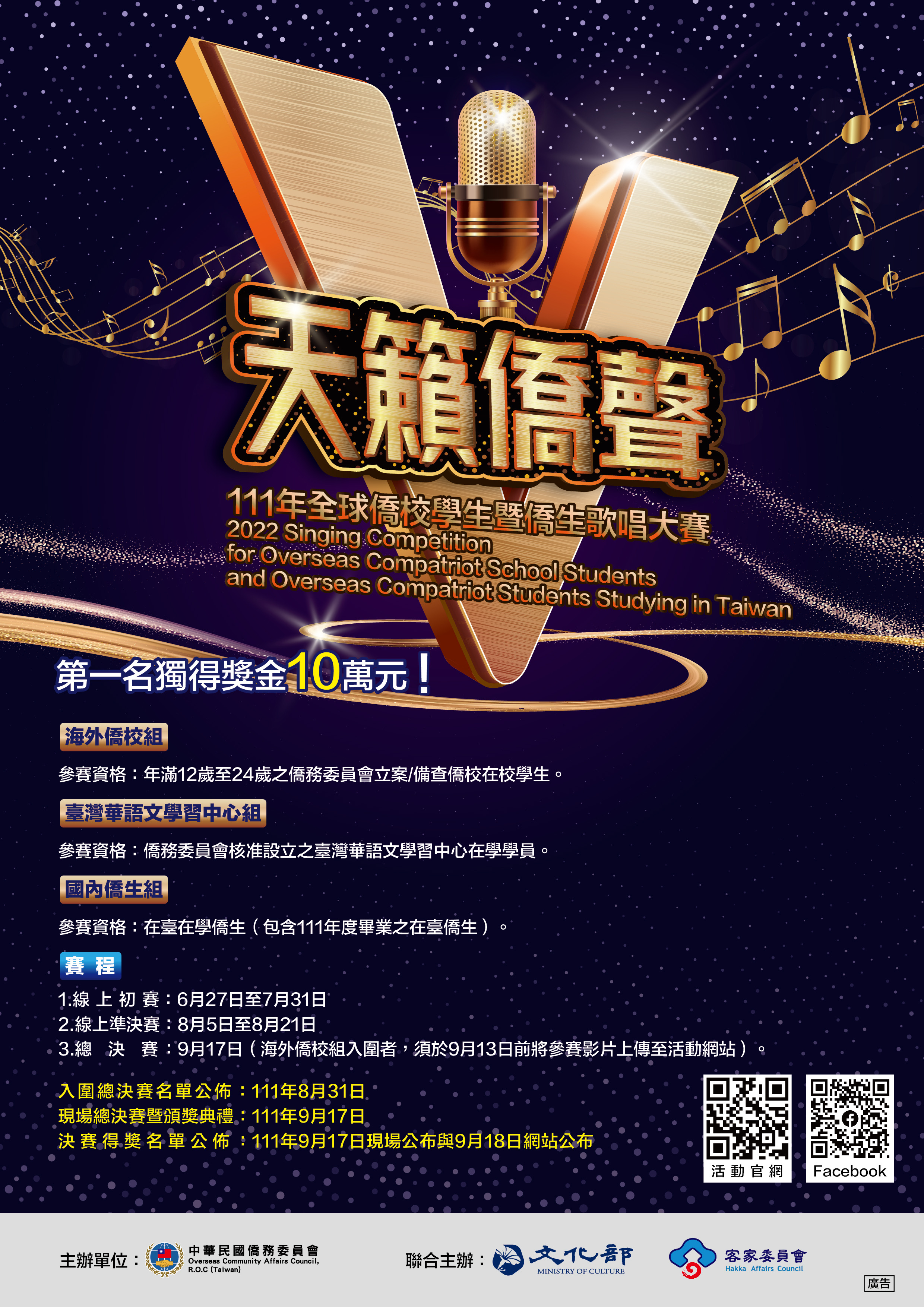 2. 線上初賽以「個人」為參賽單位;線上準決賽及總決賽可邀請其他符合資格之僑生組成團隊(包含人聲與伴奏),但每一人以參加一組為限。