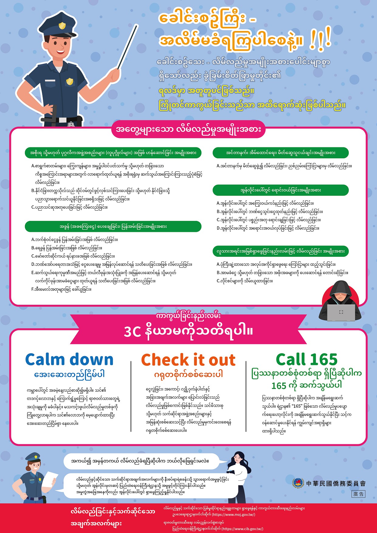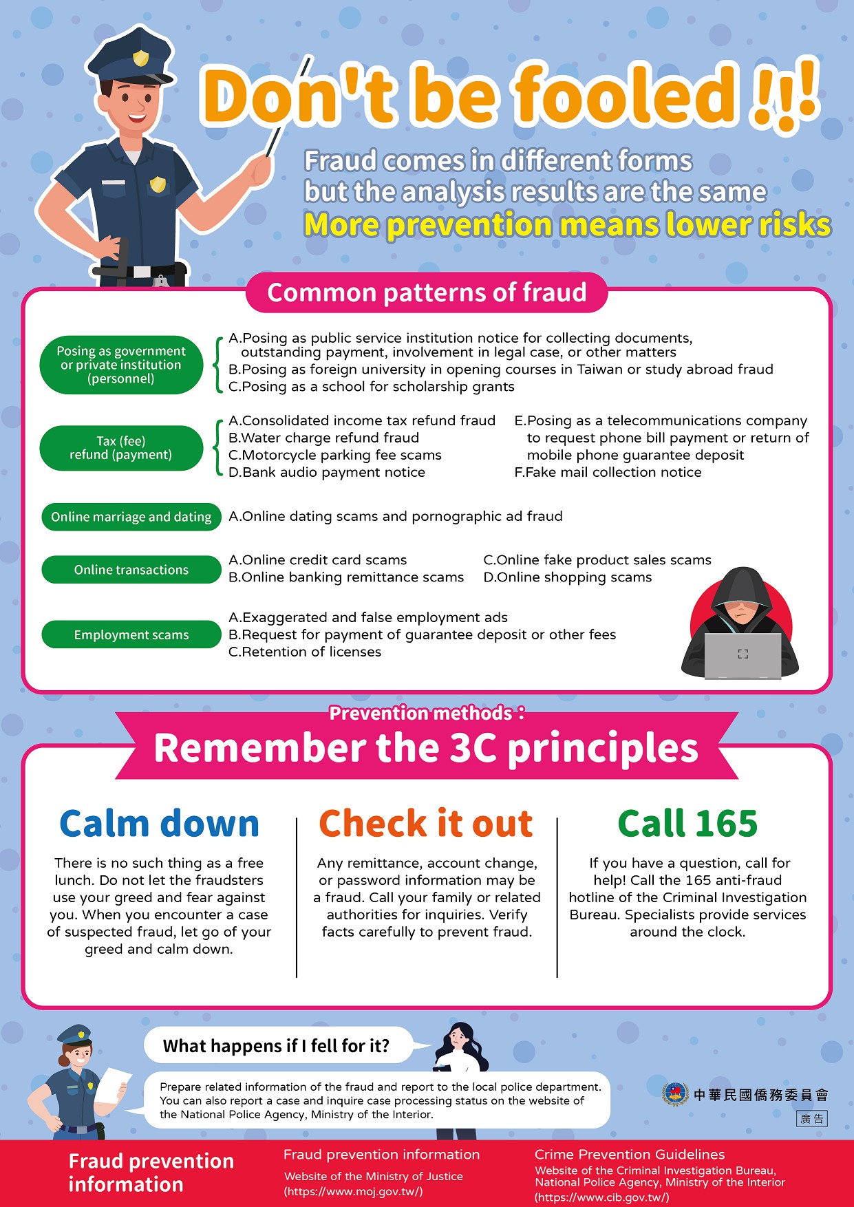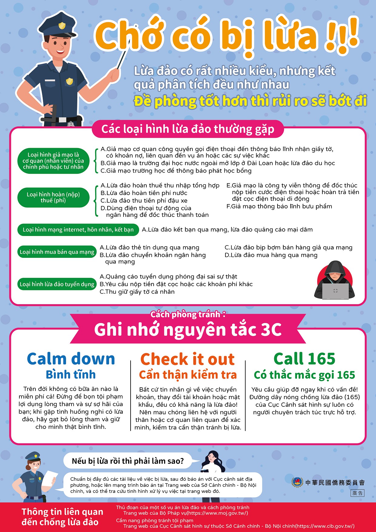 邇來媒體報導,詐騙集團利用社群軟體偽裝金融機構官方帳號,誘騙僑生進行匯款。為避免同學受騙,請同學們加强對於詐騙的警覺,以免損失寶貴財產。僑務委員會已製作泰文、越南文、印尼文、緬甸文及英文等五國語版反詐騙EDM(如附件),提醒僑生同學提高警覺、隨時查證,以避免受騙。