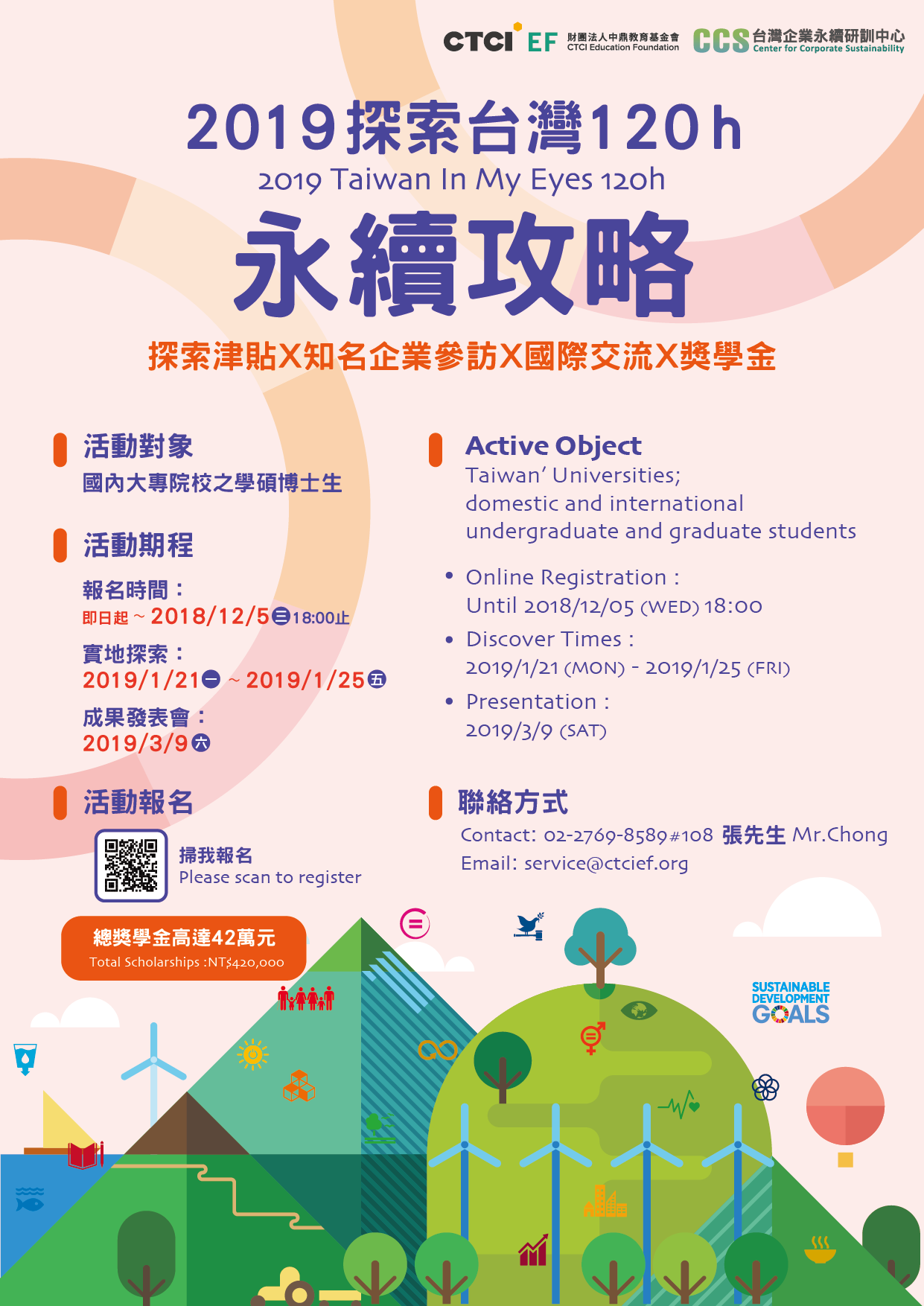中鼎教育基金會(CTCIEF)與台灣企業永續研訓中心(CCS)(簡稱主辦單位)為鼓勵大學院校本國籍及外國籍同學交流互動,以及了解臺灣推展「聯合國永續發展目標(SDGs)」現況並增進大學生對國內標竿企業永續行動之瞭解,自2017年暑假起即共同辦理首屆「2017探索台灣120h」活動,獲得社會、媒體廣大迴響及豐碩成果。為達本活動目的及持續各校同學參與動能,主辦單位將於2019年1月21至25日賡續辦理第四屆「2019探索台灣120h-永續攻略」活動。 (本活動預計前往中鼎工程、南亞科技股份有限公司、綠色夢工廠、台中科學園區管理局、中油高雄煉油廠環境教育園區進行企業參訪)