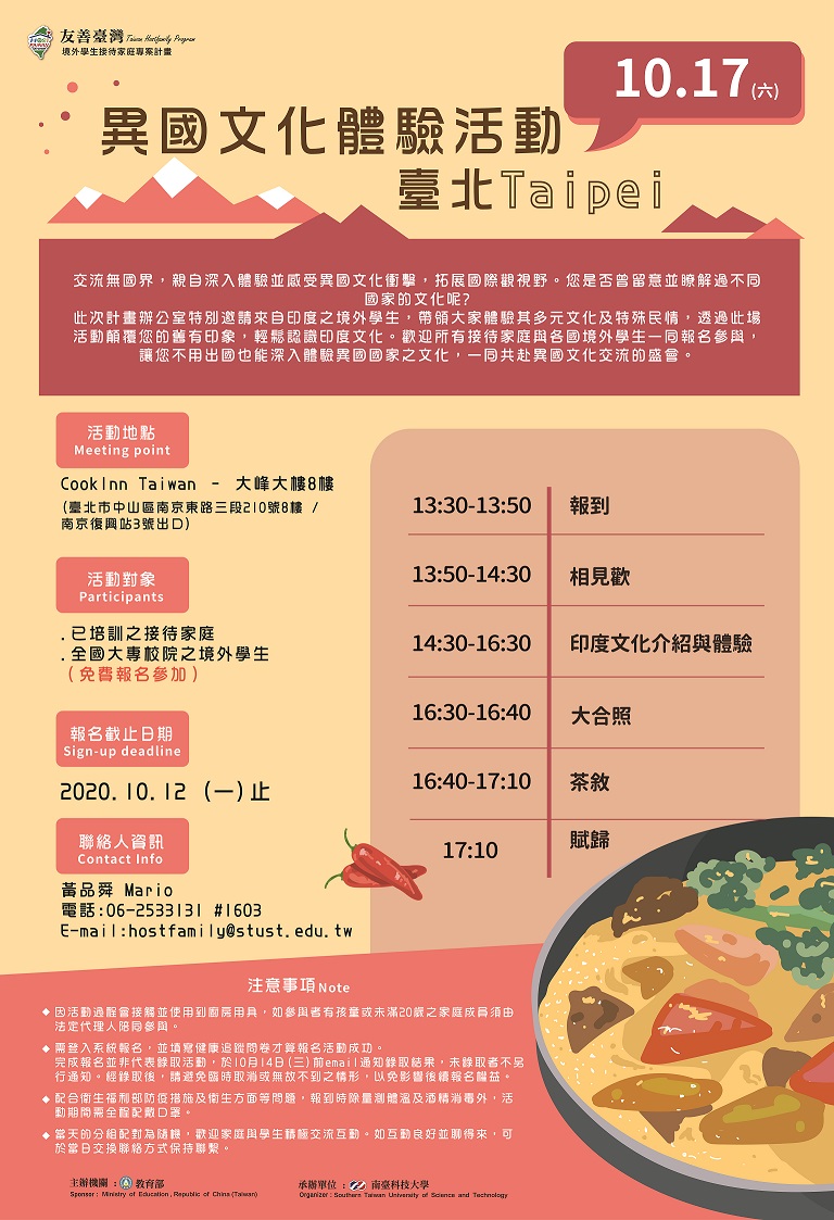【友善臺灣-境外學生接待家庭專案計畫】將在10月17日(六)於臺北辦理「異國文化體驗活動」,