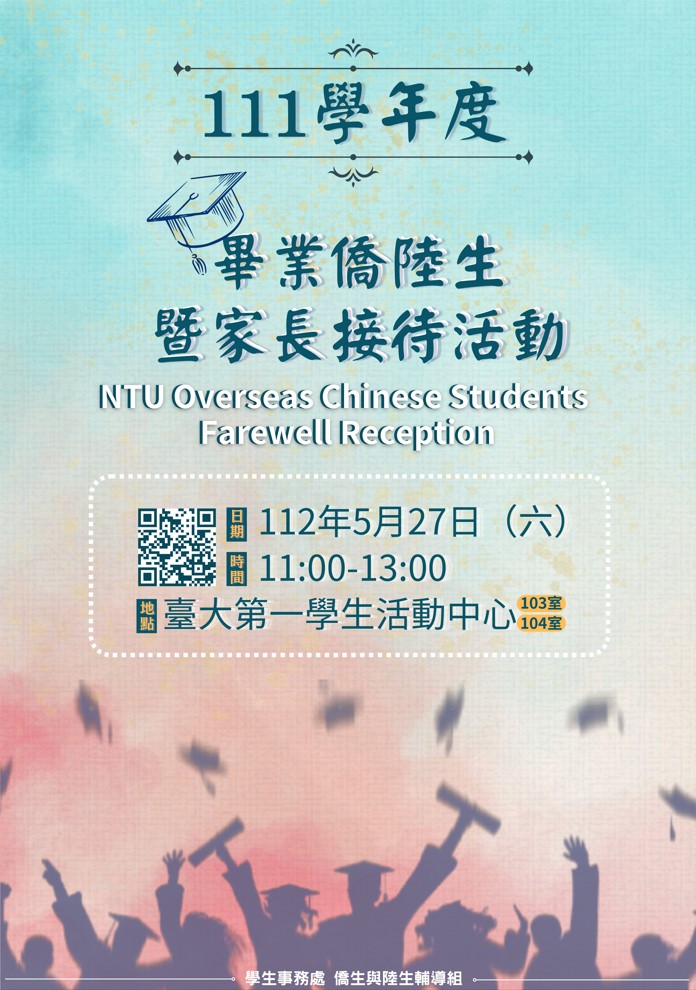 The Overseas Students Advising Division will hold the "NTU Overseas and Mainland Chinese Students Farewell Reception" on May 27th (Saturday) in Room 103 and 104 of the First Student Activity Center. We have prepared exquisite gifts (diploma certificate holders) and meals to express our sincere congratulations!