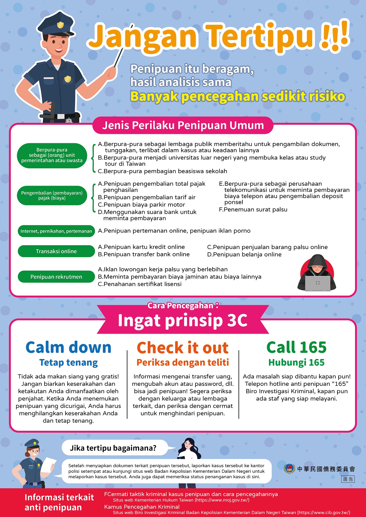 Recently, the fraud rings are targeting overseas Chinese students with limited proficiency in Mandarin, enticing them to provide their bank accounts for money laundering purposes. To prevent students from becoming involved in fraud cases, we urge everyone to increase their vigilance against scams to avoid falling victim or being unwittingly implicated in legal troubles. The Overseas Community Affairs Council has produced anti-fraud EDMs in five languages—Thai, Vietnamese, Indonesian, Burmese, and English (as attachment)—to remind overseas Chinese students to stay alert and verify information to avoid being deceived.