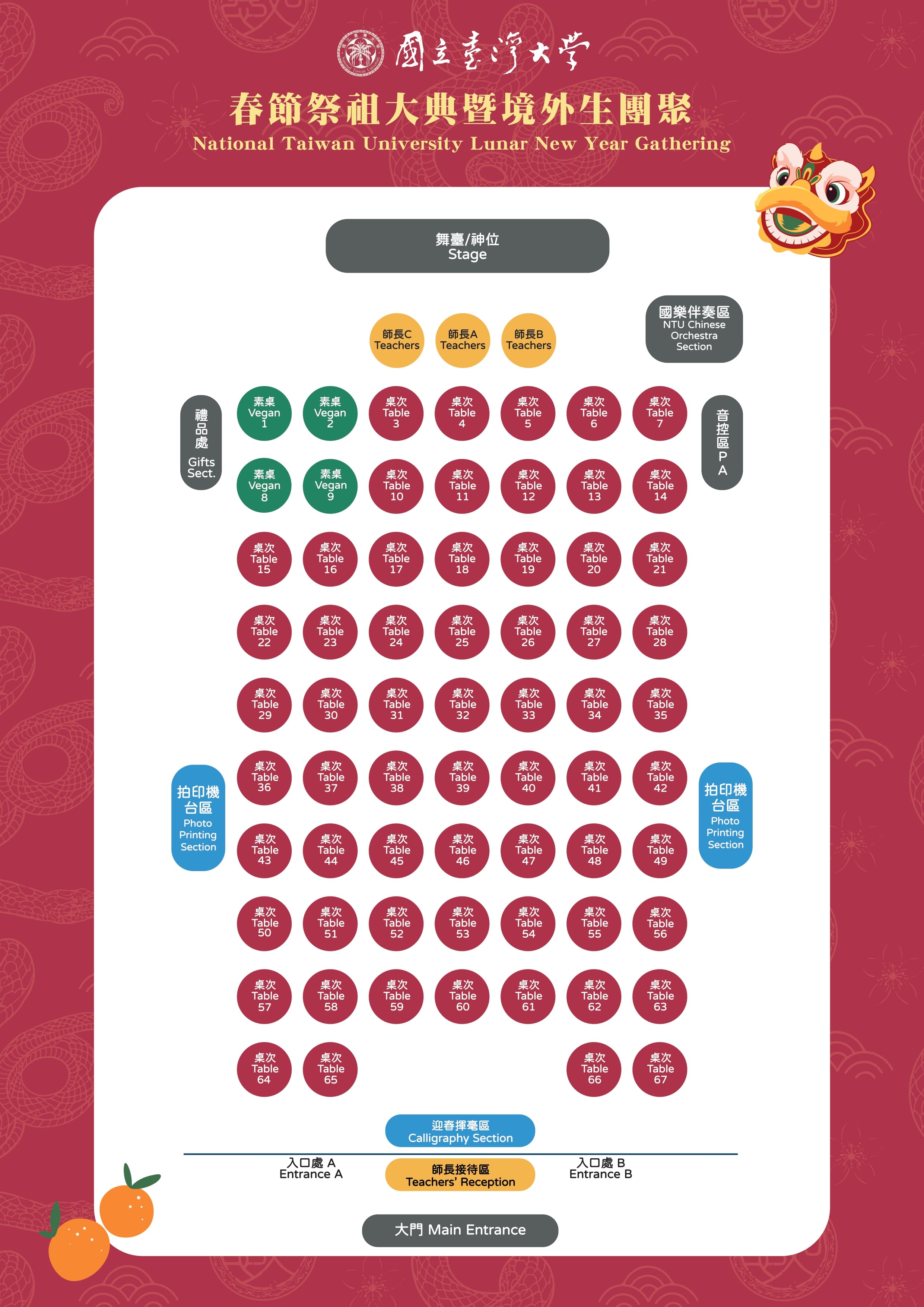 We are excited to invite you to the "NTU Lunar New Year Gathering," which will be held on December 22nd (Sunday) from 10:00 AM to 2:00 PM at the old gymnasium on our campus. The event, hosting around 700 participants, including our overseas Chinese students, mainland Chinese students, and international students, will feature an ancestral worship ceremony, banquet, opening calligraphy performance, red envelopes offering, lion dance performance, student clubs performances, lucky draw session, and more.