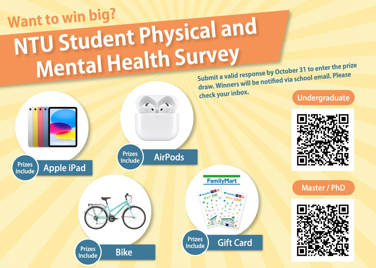 Dear NTU Students, Over the past three years, the Student Counseling Center at the Office of Student Affairs (OSA) has conducted an online survey to understand the overall physical and mental well-being of students, including both undergraduate and graduate students. Your participation helps the university better understand student needs and allows us to create services that are more aligned with those needs. This survey is funded by the university and has been reviewed by the Behavioral and Social Sciences Research Ethics Committee (Approval No. 202507HM096). The survey will take approximately 20-30 minutes to complete. Upon submitting a valid response, you will be eligible to enter a lottery for a chance to win various prizes, including multiple sets of Apple 3C products (such as iPads and AirPods), bicycles, and gift certificates.